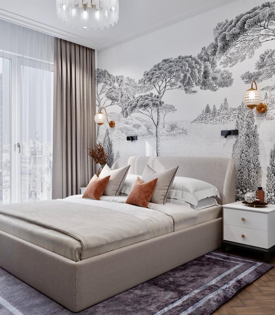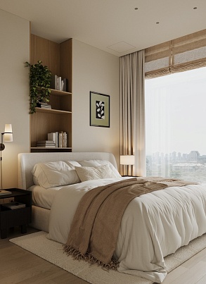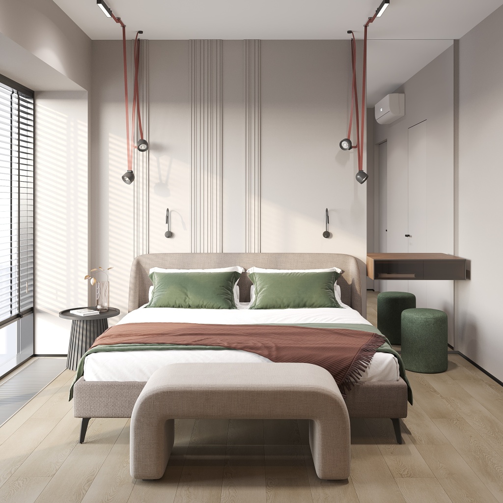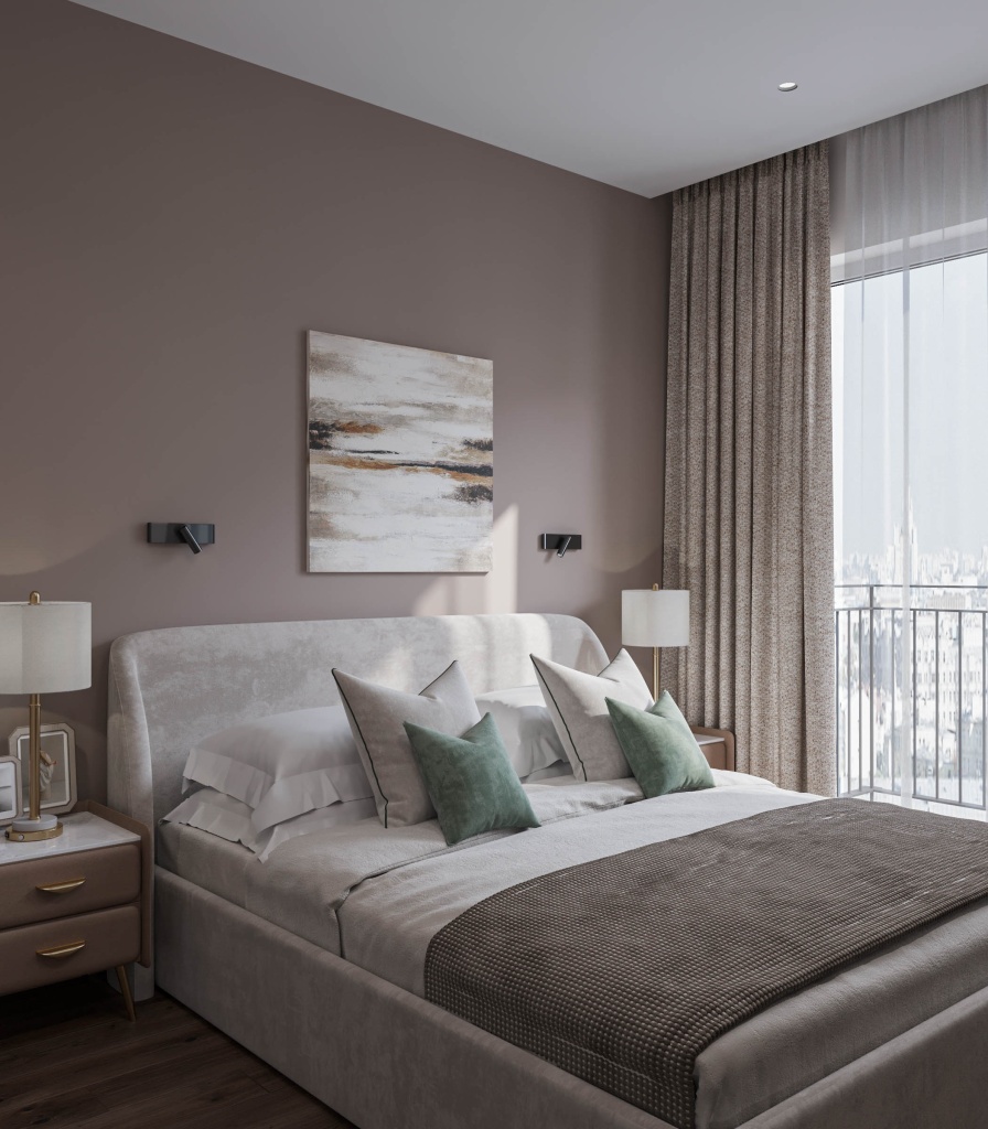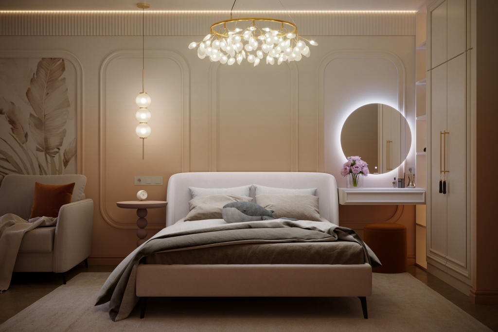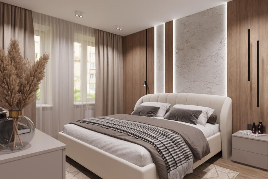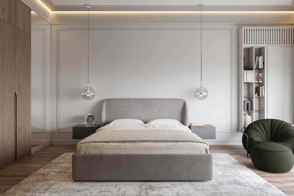 Изогнутое изголовье без декора делают кровать акцентом спальни и позволяет отнести ее к разным по стилю интерьерам.