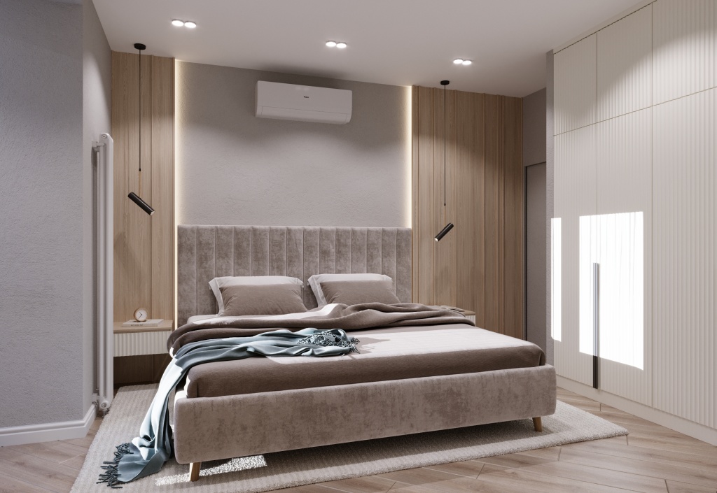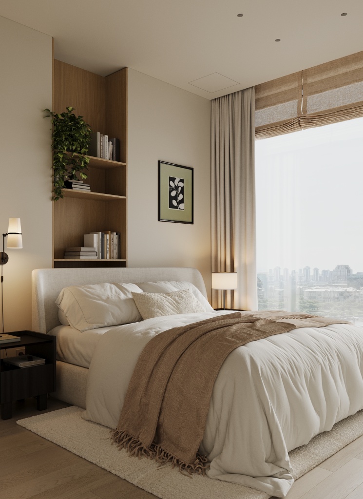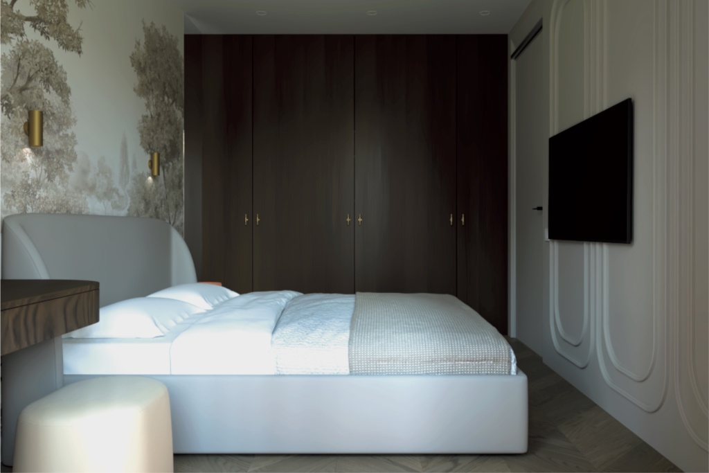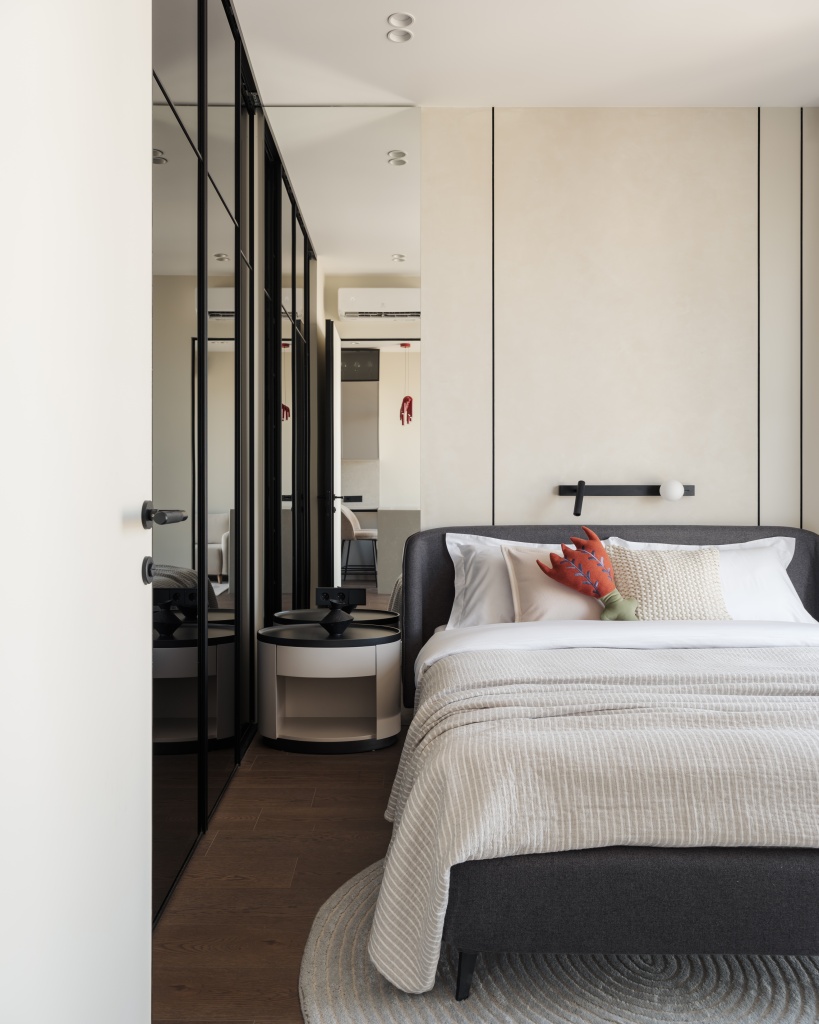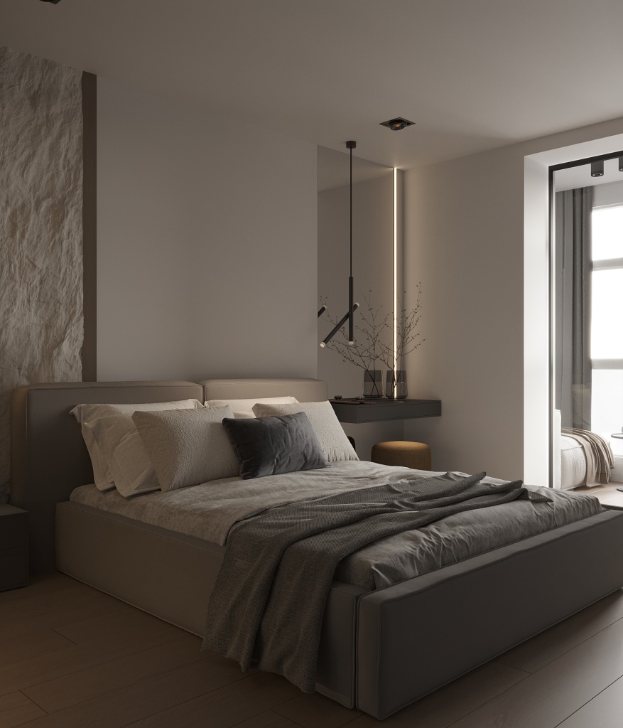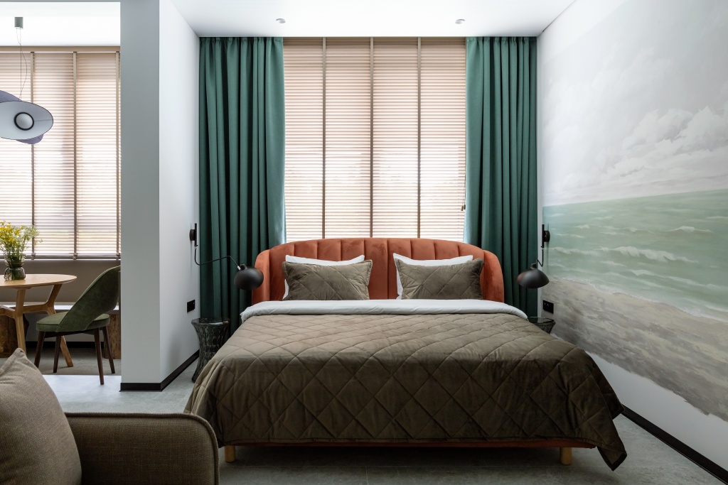 Изогнутое изголовье без декора делают кровать акцентом спальни и позволяет отнести ее к разным по стилю интерьерам.