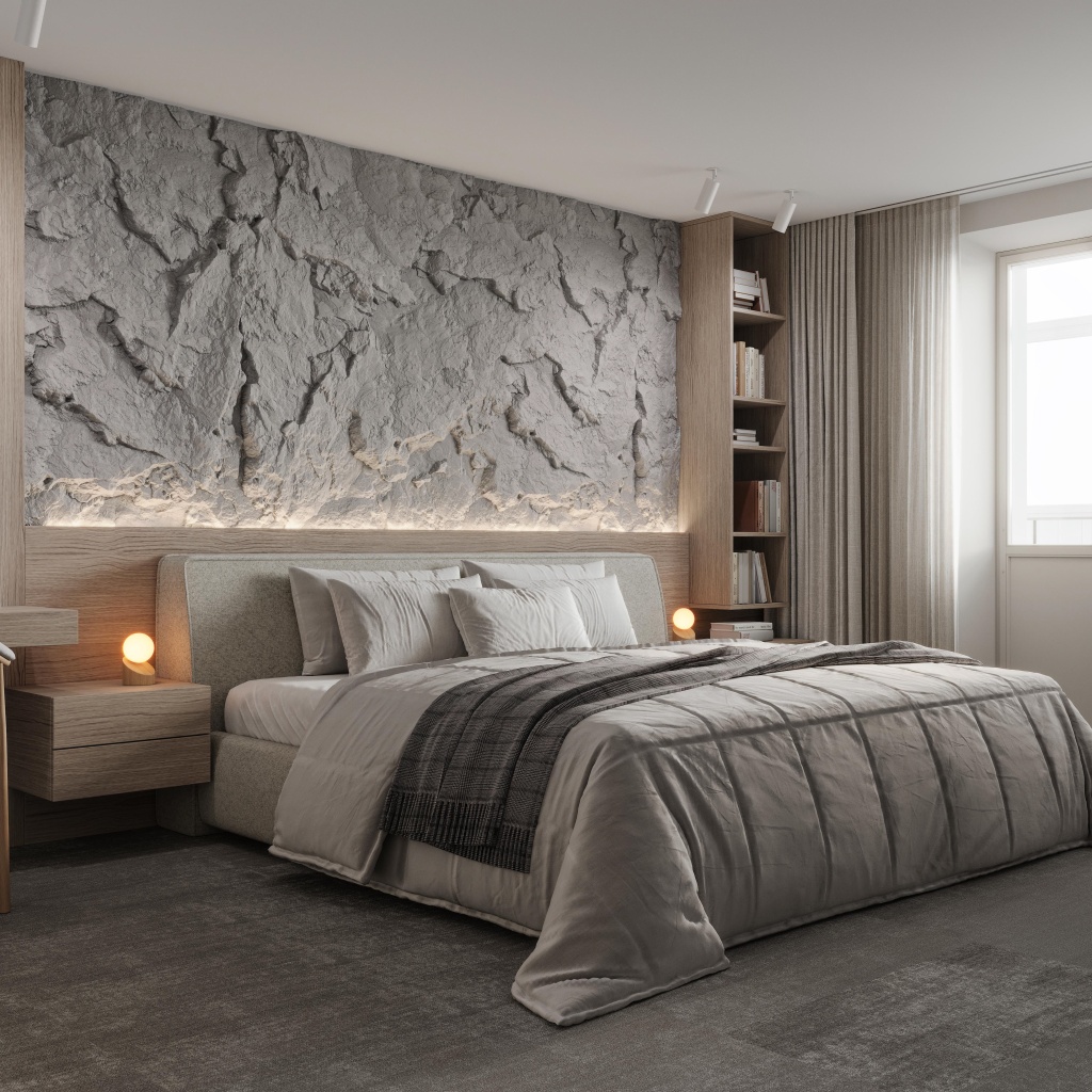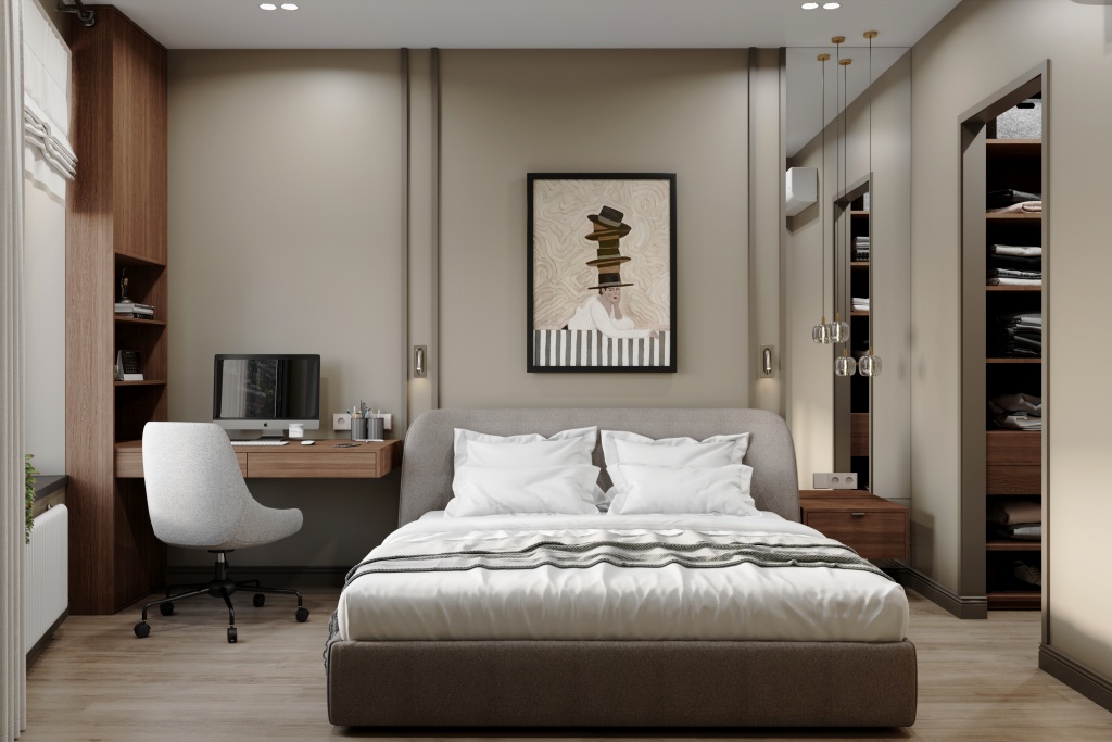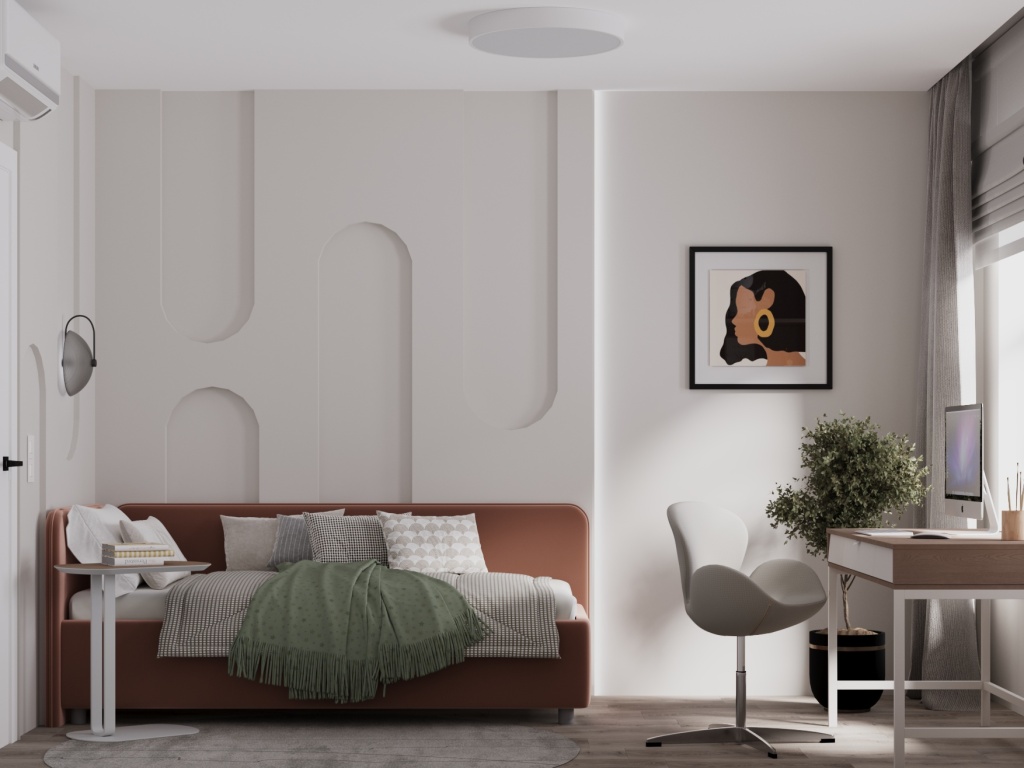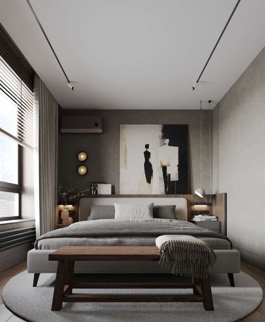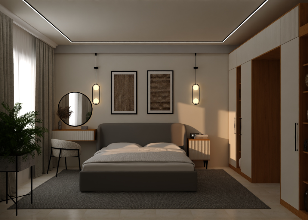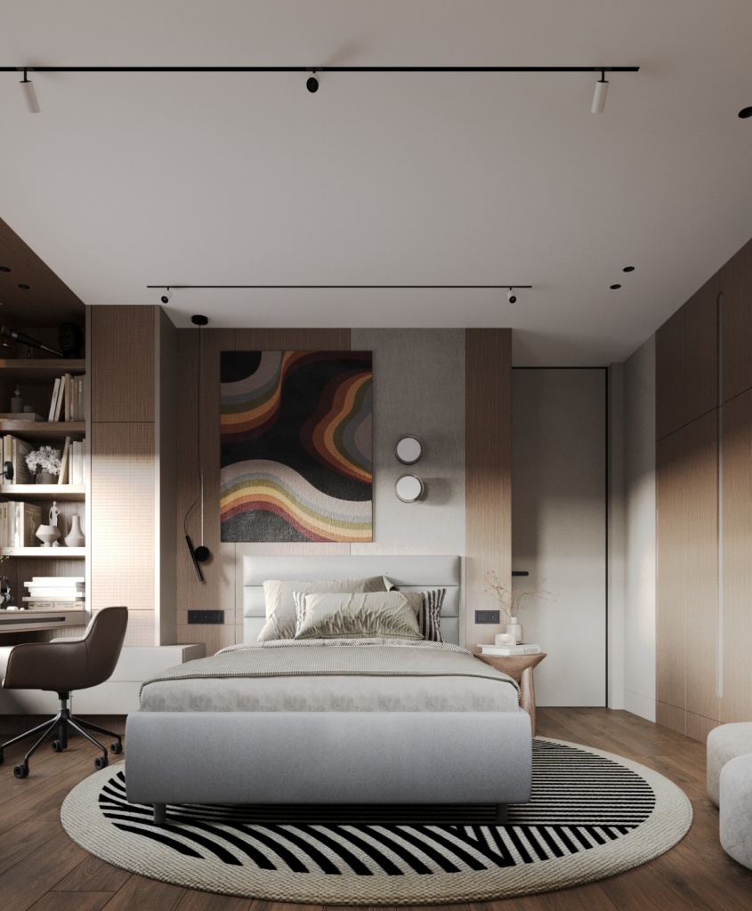 Изогнутое изголовье без декора делают кровать акцентом спальни и позволяет отнести ее к разным по стилю интерьерам.