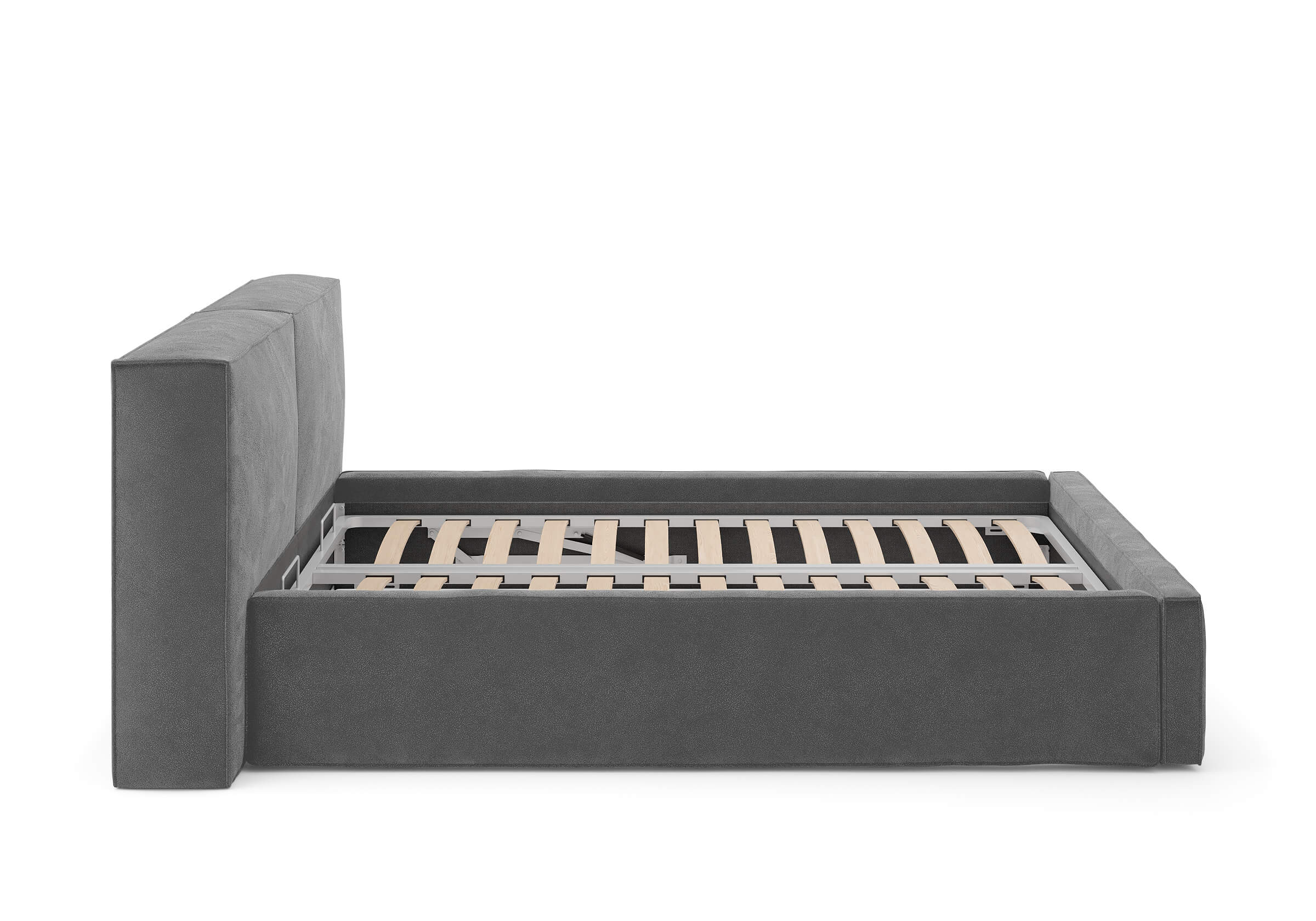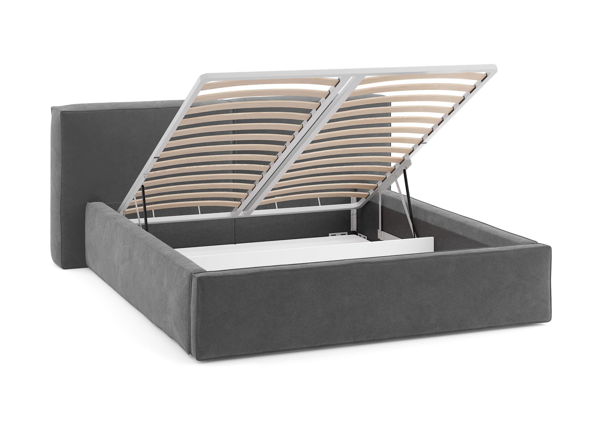 Возможна установка подъемного механизма с вместительным бельевым ящиком. Дно бельевого ящика легко сдвигается для обеспечения уборки под кроватью.