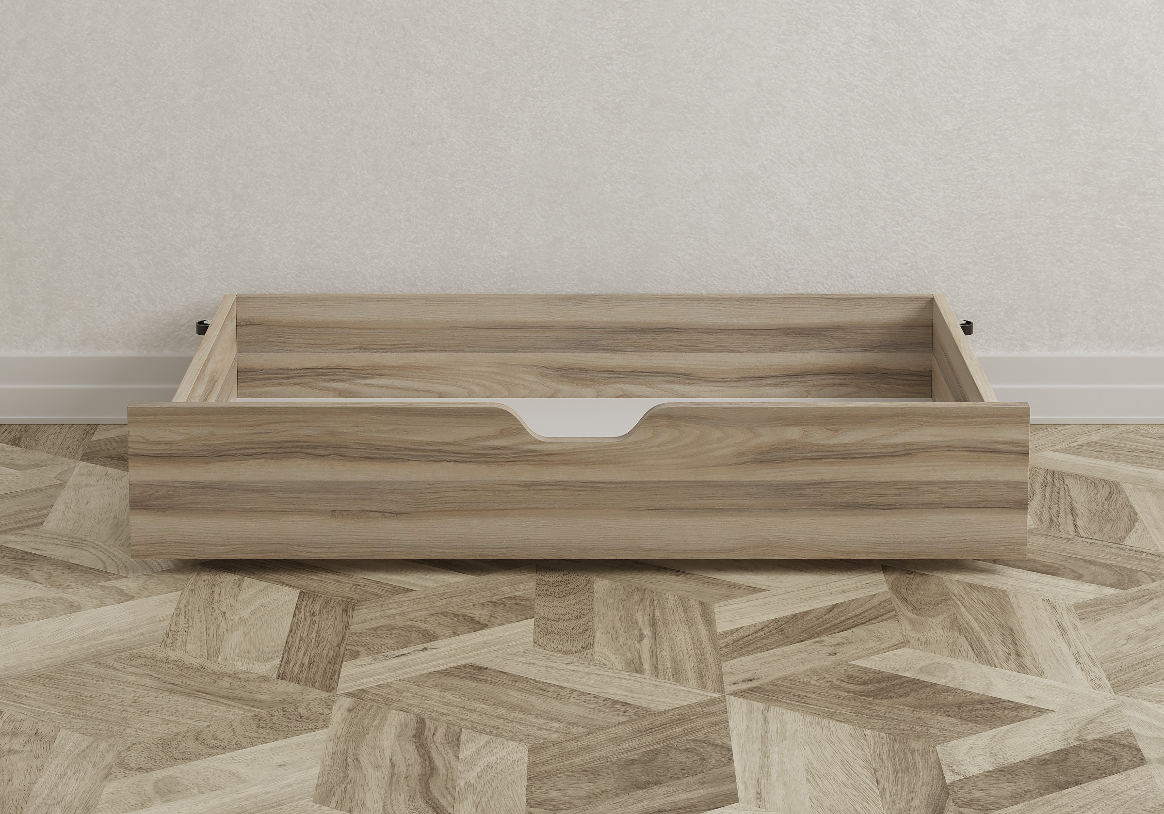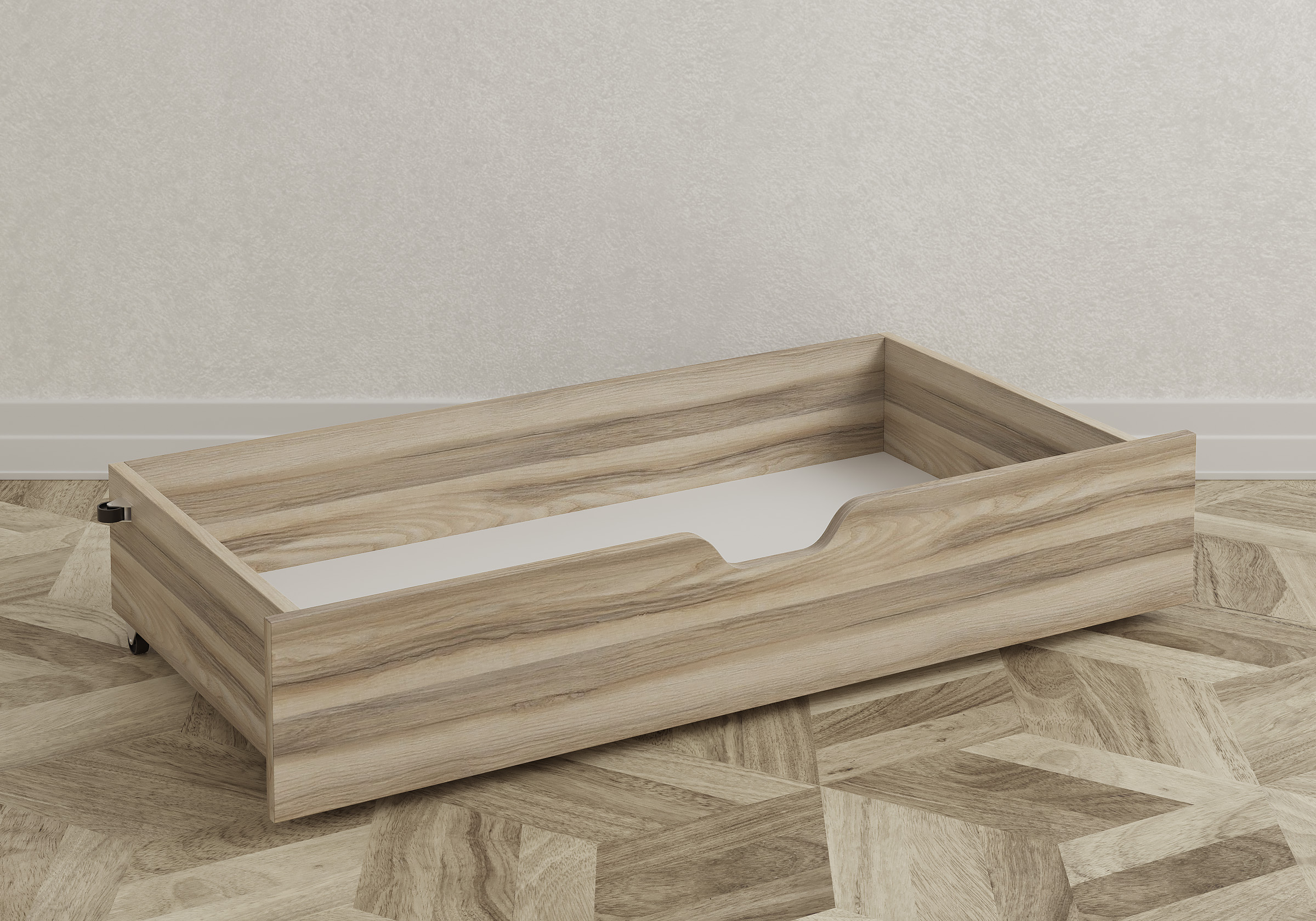 К детской кровати ящик не прилагался, заказали этот, под модель Mariana . В пазы кровати встал идеально. Очень удобная выемка и колесики. А главное, уже год и внешнего вида ни ящик ни кровать не потеряли, хоть дети в комнате своей буквально на ушах стоят. Рекомендую!